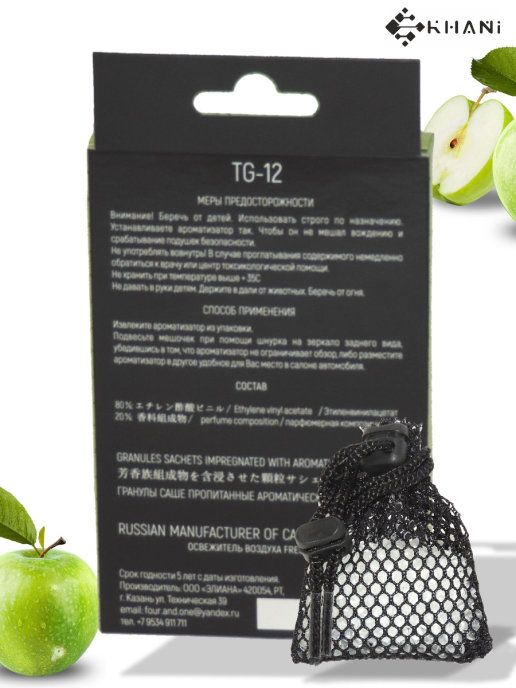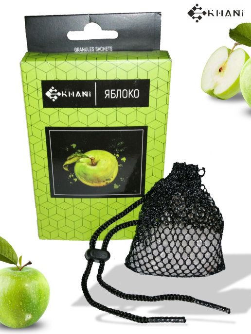 Парфюмерная освежающая композиция Khani САШЕ "Яблоко" - ароматизатор для автомобиля и дома. "Яблоко" - сладкий фруктовый аромат спелых зелёных и сочных яблок. Аромат, который знаком с глубокого детства каждому. Максимальное попадание в оригинал. Аромат осеннего настроения. Никогда не надоедает и всегда приятен при любом Вашем настроение. Поднимает настроение и вызывает позитивные эмоции. САШЕ Khani отличается от других разновидностей ароматизаторов тем, что он не теряет насыщенности запаха на протяжении всего срока службы. При контакте с воздухом пропитанные гранулы медленно испаряются, равномерно распределяя аромат по всему пространству. САШЕ Khani - это элегантный мешочек с удобным шнурком. Гранулы САШЕ легко переносят морозы, но на морозе аромат "запирается" внутри и не работает, но по мере прогрева помещения или кабины, они снова начнут радовать Вас с прежней силой и стойкостью.
