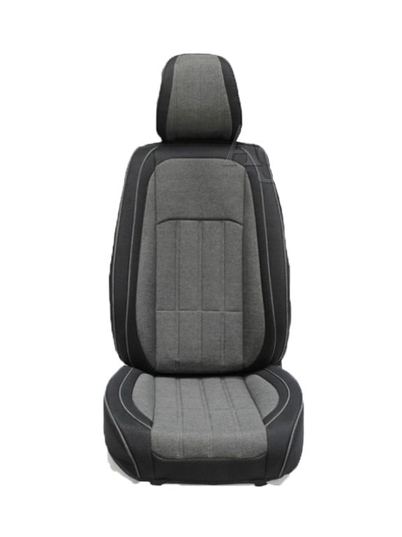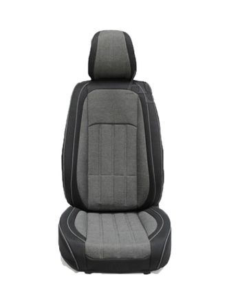 Комплект чехлов на передние сидения авто черно-серого цвета, изготовленный из льна, обеспечивают свободную циркуляцию воздуха в сидении автомобиля и незаменимы в любое время года.
