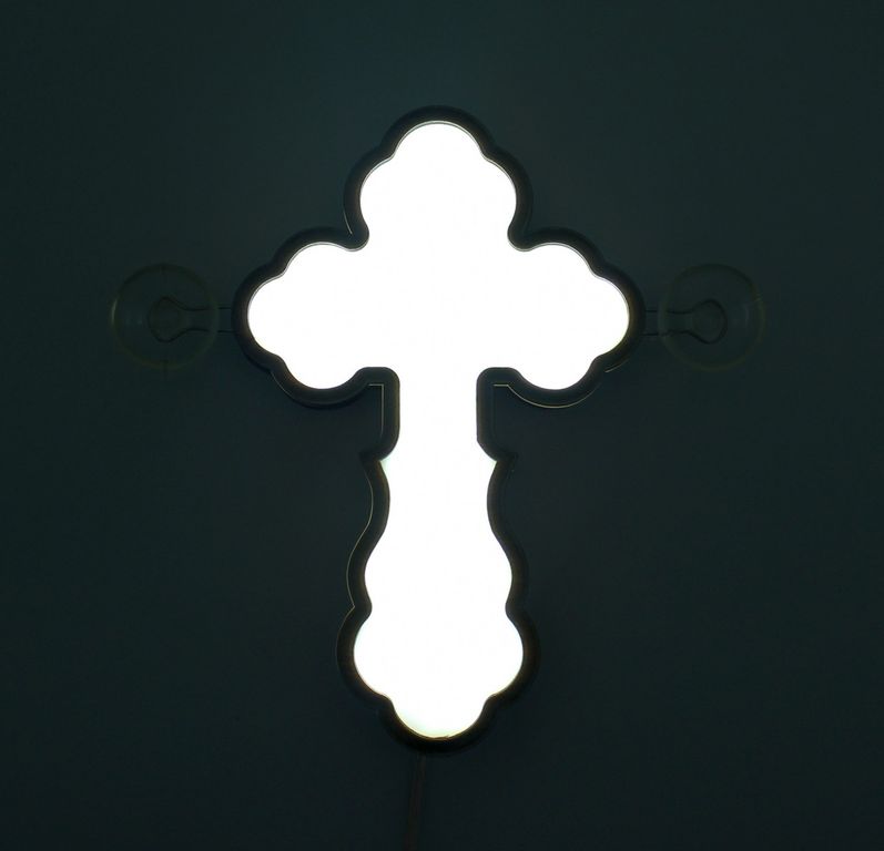 Крест православный светодиодный – символ-оберег от дорожных невзгод и опасностей. Очень красивый аксессуар в авто. Изделие крепится к лобовому стеклу или в салон авто, работает от прикуривателя.