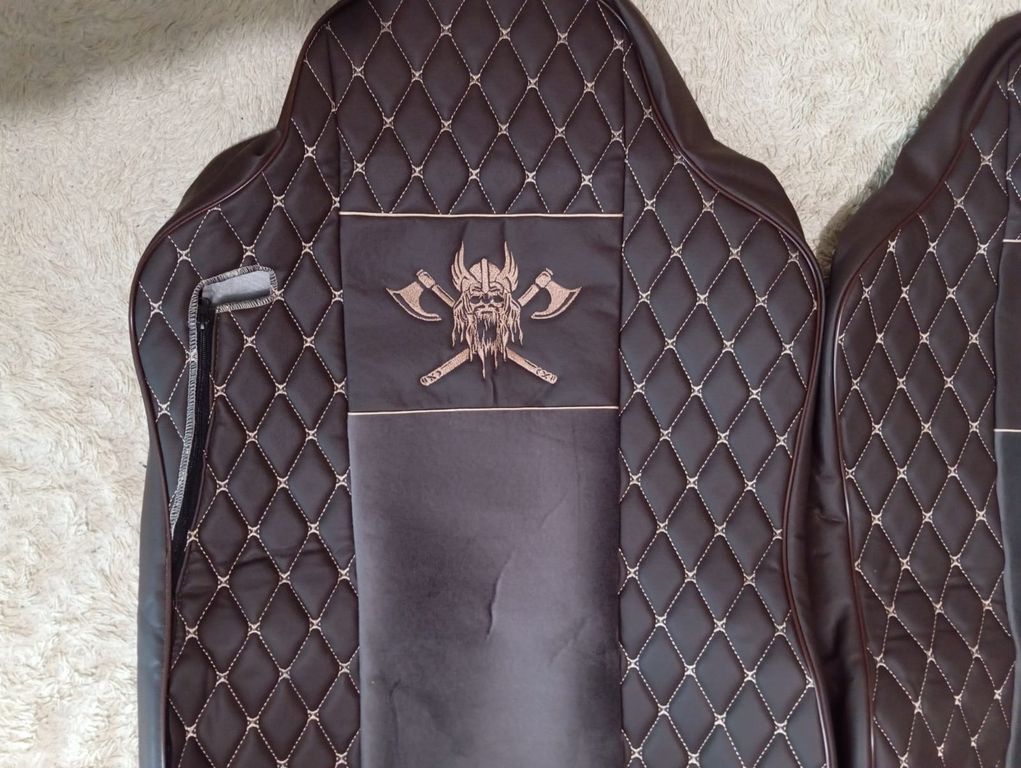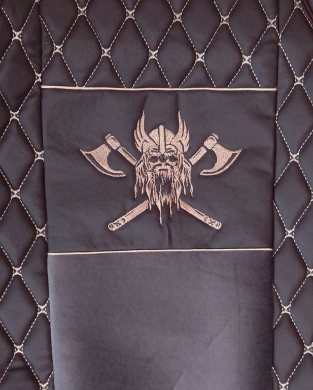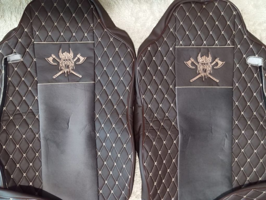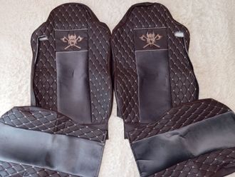 Модельные чехлы с вышивкой ВИКИНГ для ЕВРО-КАМАЗ (2 высоких цельных сидения) от компании ЕСД Авто. Авточехлы для грузовиков сшиты по специальным лекалам, созданным под конкретные модели автомобилей. Изготовлены из высококачественных и износостойких материалов. Их комбинация: из коричневого велюра (центральная часть) и искуственной коричневой кожи (боковые части). Чехлы, удивят вас своим приятным вненим видом и комфортабельностью.