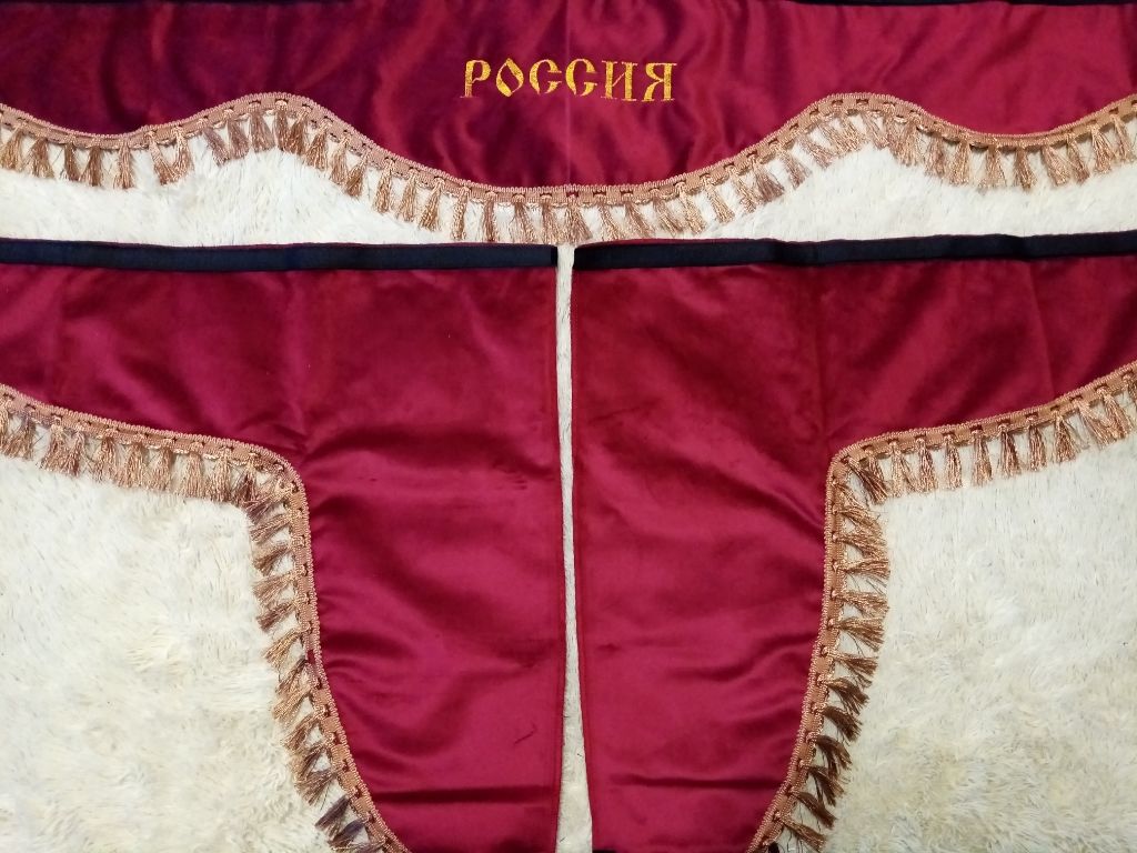 В комплект входит ламбрекен на лобовое стекло с вышивкой РОССИЯ, две косынки (шторки) на боковые стекла, двусторонняя лента-липучка для крепления.