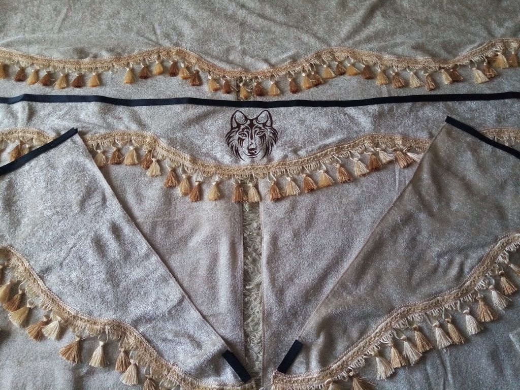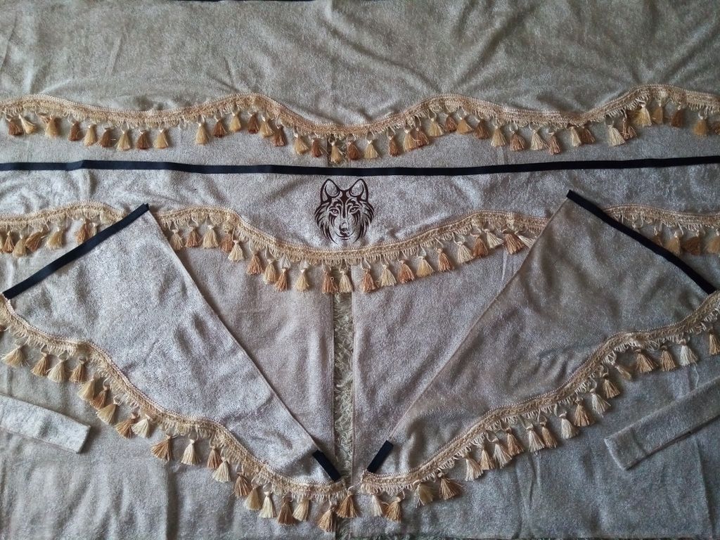 В комплект штор в кабину входит: 2 шт. шторы спального места, 1 шт. ламбрекен спального места, 2 шт. подхваты, 1 шт. ламбрекен лобового окна, 2 шт. боковые косынки.